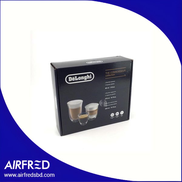 Conjunto original De’Longhi de 6 vasos de vidrio para espresso, cappuccino y latte macchiato. Disponible en AirFred.